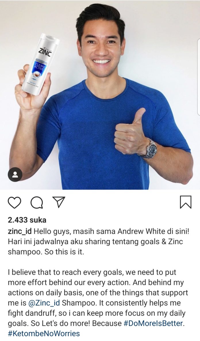 Pertukaran konten antar artis dan brand ini diakhiri dengan Andrew White membuat Instagram Live, mengundang siapa saja untuk bertanya seputar gaya hidup sehat maupun produk shampoo Zinc.