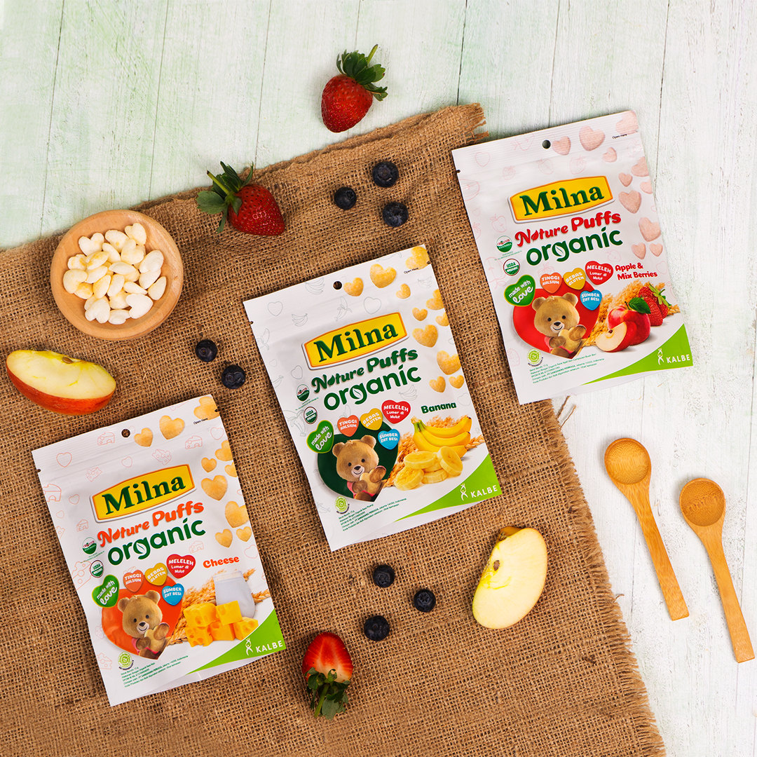 Seperti halnya Milna Nature Puffs Organic, camilan sehat berbahan organik yang tinggi kalsium, bebas gluten, dan menjadi sumber zat besi untuk melengkapi kebutuhan gizi harian si kecil.