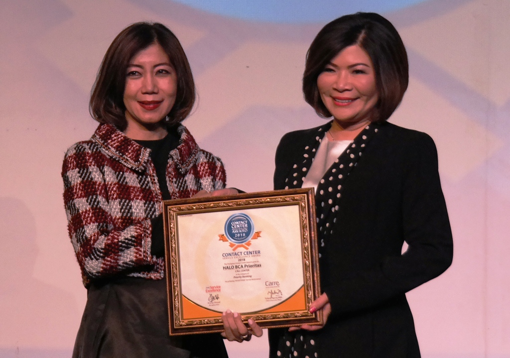 Penghargaan diserahkan CEO CarreĀ CCSL Yuliana Agung kepada Executive Vice President Center of Digital BCA Wani Sabu, beserta jajaran manajemen BCA dan perusahaan anak di Hotel Mulia, Jakarta, Selasa (10/4).