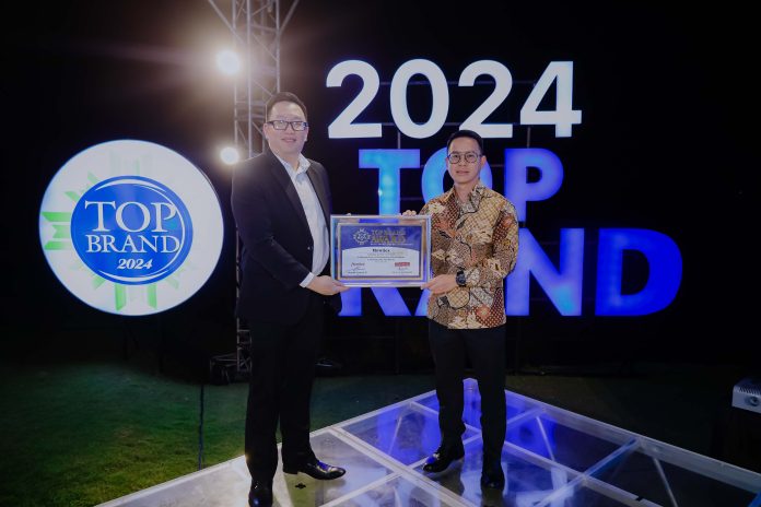 Penghargaan TOP Brand 2024 diserahkan langsung oleh Direktur Frontier Technology Rendi Peterson kepada Retail Sales Manager Bali Nusra PT Mowilex Indonesia Herman Susilo di Sky Ayana Resort Jimbaran, Bali, Rabu (7/8).