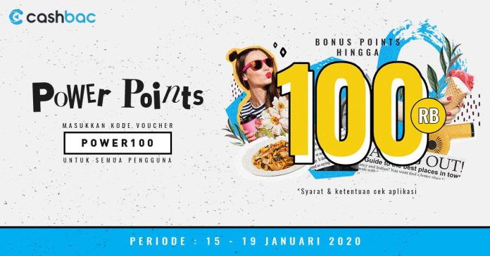 Marketing – Cashbac terus memberikan penawaran menarik, kali ini dengan hadirnya Promo “Power Points”. Dengan promo ini, Cashbac memanjakan semua penggunanya dengan rewards 20% dengan maksimal 100.000 di ribuan merchant favorit. Promo tersebut berlangsung selama 5 hari, sejak tanggal 15-19 Januari 2020. Promo tersebut dapat dinikmati sebanyak 2 kali penggunaan per harinya dengan memasukkan kode voucher Power100.