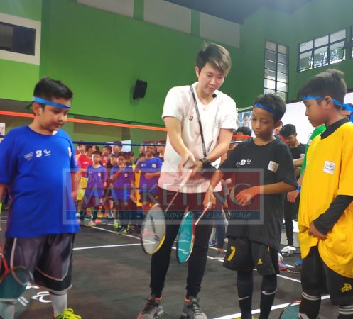 Lilyana "Butet" Natsir, mantan pemain badminton ganda campuran peraih medali emas Olimpiade memberikan contoh memegang raket bulutangkis yang benar agar anak-anak bisa bermain dengan baik di ajang "Bridgestone Olympic a GO GO!" Di Jakarta (04/05/19). Foto: Majalah MARKETING.