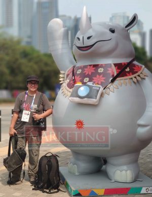 Seorang pengunjung berpose di sebelah patung balon raksasa dari maskot Asian Games 2018, Kaka. Banyak pengunjung yang memanfaatkan berfoto bersama salah satu maskot Asian Games 2018 ini di Senayan, Jakarta, (20/08). Foto: Majalah MARKETING/Lialily.