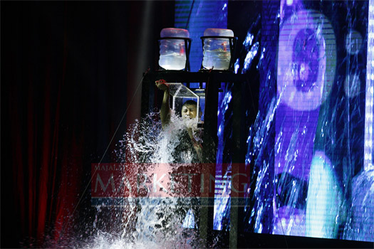 Demian Aditya (The Escapist) tengah berusaha melepaskan rantai dan gembok yang mengikat tangan serta kepalanya agar dapat lolos tepat waktu sebelum air memenuhi kotak di kepalanya. Foto: Majalah MARKETING/Lialily