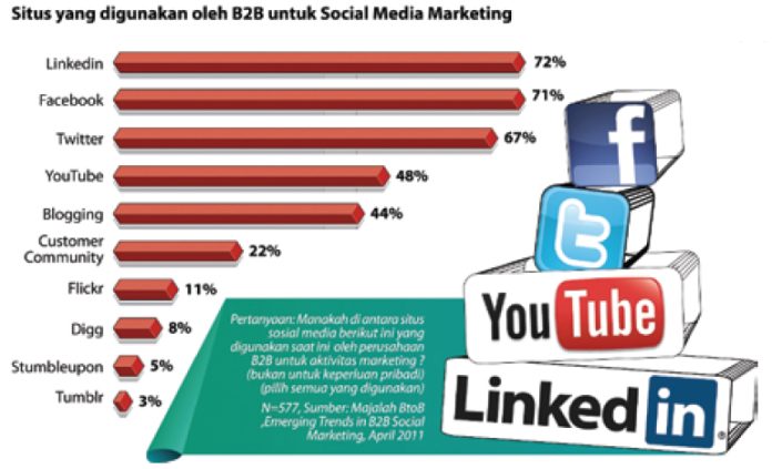 Situs-situs social media, menurut tingkat kepopulerannya, yang digunakan oleh perusahaan-perusahaan dan diikutsertakan dalam riset ini adalah Facebook, Twitter, LinkedIn, dan YouTube. Ini berbeda dengan riset atau survei yang dilakukan oleh BtoB Online belum lama ini, yang melaporkan bahwa responden mereka lebih banyak menggunakan LinkedIn, lalu Facebook, Twitter, dan YouTube.