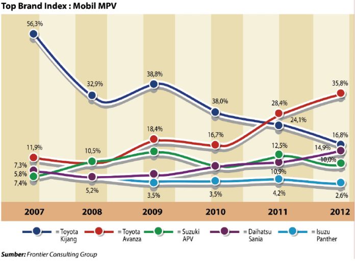 Mengamati hasil Top Brand Index untuk kategori MPV akan melengkapi semua cerita ini. Indeks dari Toyota Kijang sejak tahun 2007 terus mengalami penurunan. Di tahun 2007, indeksnya masih 56.3% dan tinggal 16.8% di tahun 2011. Kalau ini terus terjadi dan Kijang Innova tidak melakukan perubahan produk, saya prediksi, indeksnya akan tinggal 10%. Di sisi lain, indeks Avanza terus meningkat dan mencapai indeks 35.8% di tahun 2011. Ini juga sejalan dengan tingkat penjualan di tahun 2011 yang mencapai 162.367 dibanding dengan Kijang Innova yang tinggal 54.763. Xenia yang penjualannya di atas Kijang Innova, indeks kekuatan mereknya bertengger di tempat ketiga di tahun 2011.