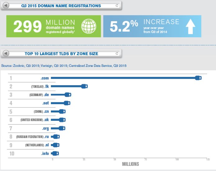 VeriSign, Inc. melaporkan bahwa jumlah nama domain di internet telah bertambah sekitar 3,1 juta selama kuartal ketiga di tahun 2015, dengan total nama domain yang terdaftar mencapai 299 juta dari seluruh domain tingkat atas/top-level domains (TLDs) per 30 September 2015 berdasarkan data Domain Name Industry Brief.
