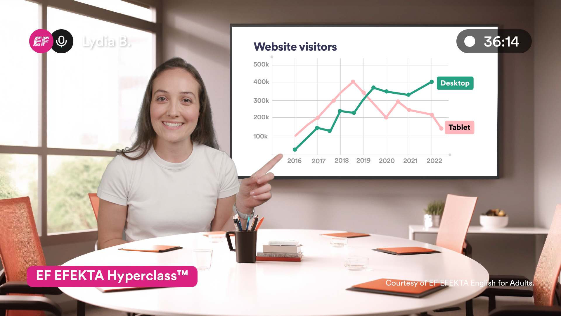 Hyperclass adalah kelas online imersif yang dirancang untuk memberikan pengalaman belajar bahasa Inggris yang dinamis dan autentik. Setiap sesi Hyperclass berdurasi 40 menit dan dipandu secara privat oleh pengajar internasional EF, dengan materi yang disesuaikan dengan level bahasa Inggris siswa.