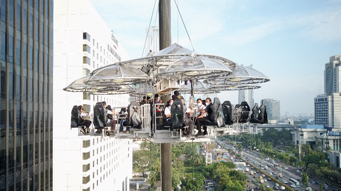 Dengan menjanjikan pemandangan indah 360° langit-langit Ibukota juga Semanggi Butterfly, platform melayang ini dapat mengakomodasi hingga 32 orang tamu pada saat bersamaan sembari menikmati hidangan four course meal yang dihidangkan oleh BOCA RICA Tapas Bar & Lounge selama satu jam.