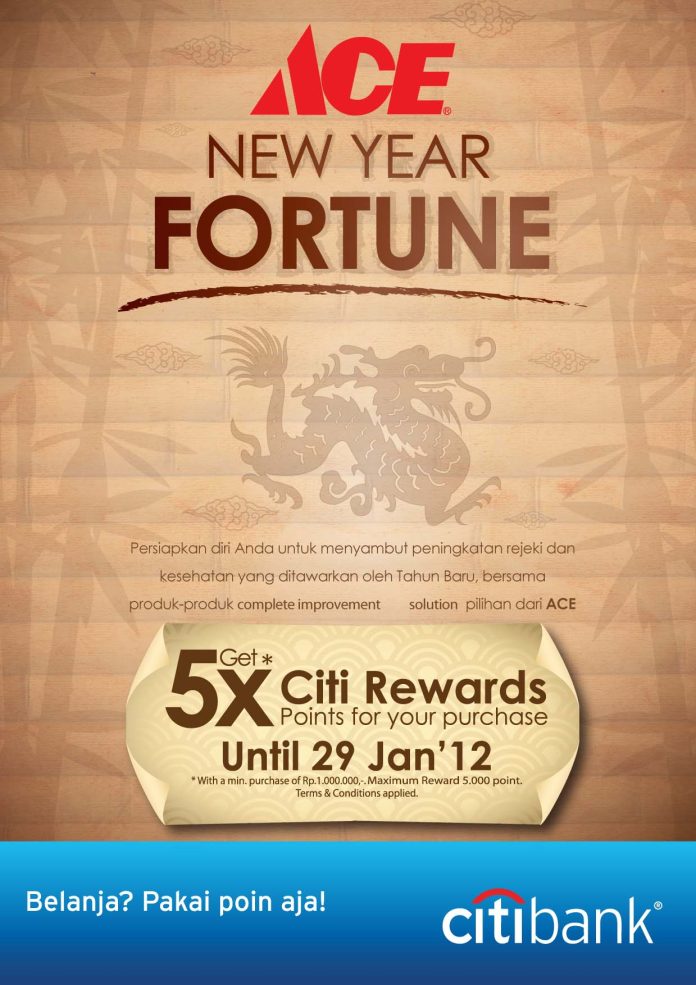Selama program New Year Fortune berlangsung, ACE bekerjasama dengan Citibank memberikan 5x Citi Points Rewards setiap Anda berbelanja minimum Rp1,000,000. Syarat dan ketentuan berlaku.