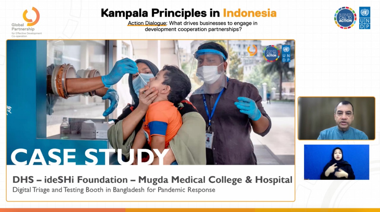 Di acara tersebut, Saber Chowdhury, anggota Business Leader Caucus, memaparkan studi kasus Kampala Principles di Bangladesh, yang berfokus pada triase dan tempat test Covid-19 inovatif di Dhaka. Tempat pengecakan yang menawarkan tes Covid-19 dengan harga terjangkau untuk masyarakat berpendapat rendah, merupakan kolaborasi antara social enterprise Digital Healthcare Solutions (DH), yayasan Institute for Developing Science and Health Initiatives (ideSHI), dan rumah sakit publik, Mugda Medical College & Hospital di Dhaka.