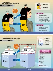 - Dengan menawarkan kenyamanan melalui produk leave-on, nilai penjualan Hair Conditioner tumbuh 68% pada tahun 2010. Produk leave-on menawarkan kepraktisan, meskipun harganya lebih dari dua kali kondisioner rambut biasa. Varian ini mengalami pertumbuhan tiga kali lipat di tahun 2010.