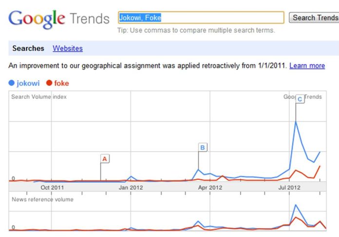 Kata-kata kunci seperti Foke Jokowi, Jokowi Foke, Foke Nara, Jokowi Ahok, Pilkada DKI pun semakin berseliweran di internet. Nah, jika kita mencoba melihat salah satu parameter di dunia internet, yaitu Google Trends dalam 12 bulan terakhir, terlihat bahwa Jokowi mengungguli Foke, khususnya semenjak awal Maret 2012.