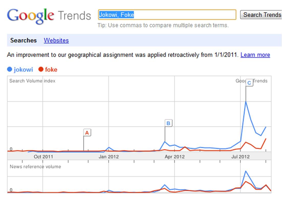 Dalam gambar yang kami sertakan di atas, para pengguna internet terlihat jauh lebih sering mencari informasi mengenai Jokowi dibandingkan Foke, khususnya periode Juli 2012 yang terlihat mencolok. Bahkan, berita-berita yang muncul pun lebih sering membahas Jokowi dan bukannya Foke.