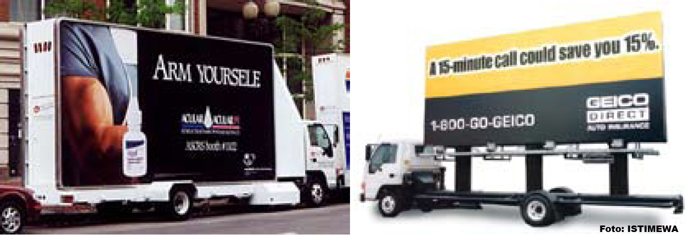 Begitu banyak media yang bisa digunakan. Namun, dibutuhkan sentuhan seni dan kreativitas di dalam produksi bentuk dan aplikasi pembuatannya. Tak kalah menantang adalah mengkreasikan tampilan visual dari isi pesan yang akan disampaikan. Kali ini kami mencoba memberikan beberapa visual yang mungkinsecara khusus ditujukan dalam promosi yang bergerak. Baik itu menggunakan alat transportasi yang besar semisal truk, mobil, bahkan yang paling kecil, yaitu manusia. Kiranya ini bisa menjadi inspirasi bagaimana para pemasar akan menggunakan dan menggembangkan ide-ide pemasarannya.