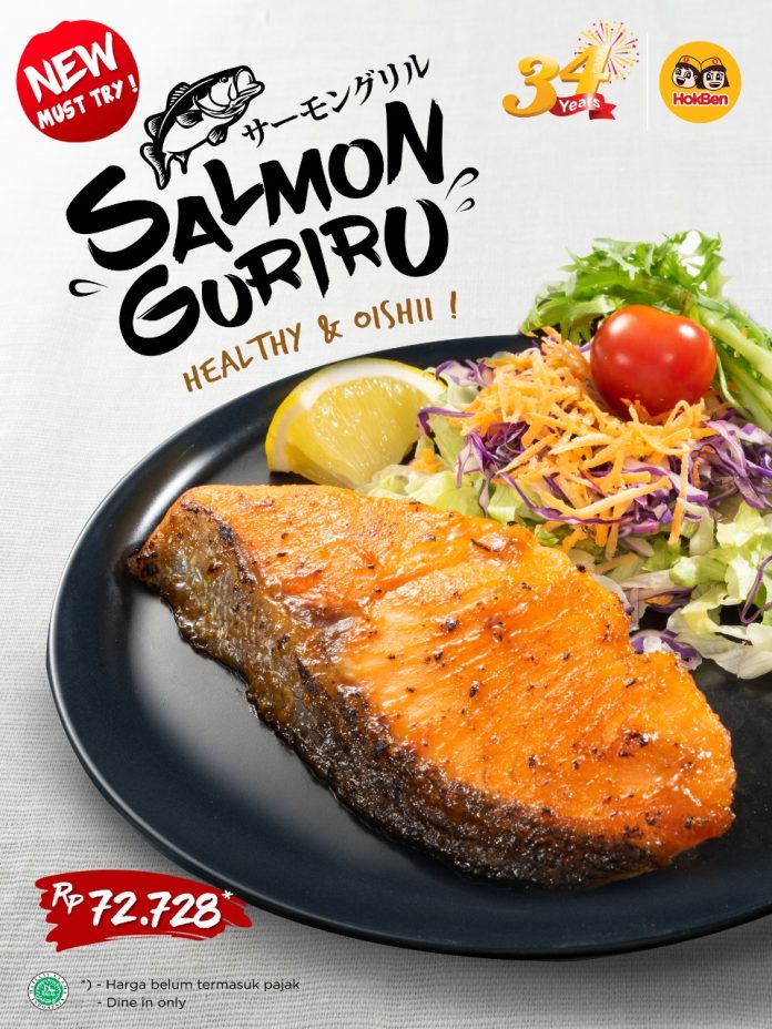 Francisca Lucky, Marketing Communication Group Head PT Eka Bogainti (HokBen) mengatakan, “Dengan tetap mempertahankan produk berintegritas dan layanan berkualitas bagi para pelanggan setia, HokBen menghadirkan menu sehat dan oishii, yakni Salmon Guriru. Daging salmon fillet yang dipanggang dengan saus teriyaki, disajikan dengan salad lengkap dengan lemon sebagai garnish. Menu ini sudah tersedia di 23 store HokBen dan bisa dinikmati khusus dine in, sejak 13 Juli 2019 dengan harga Rp.80.000, sudah termasuk pajak,” kata dia.